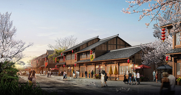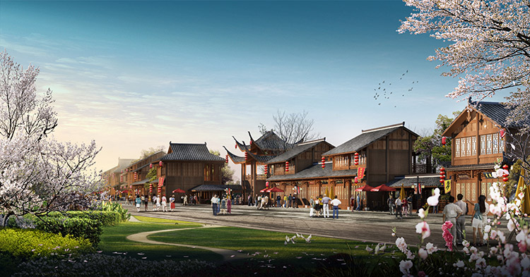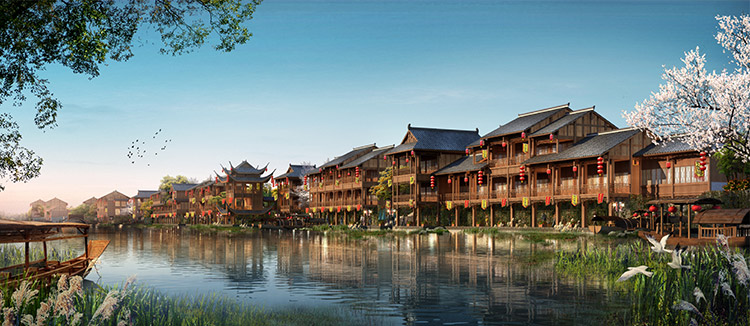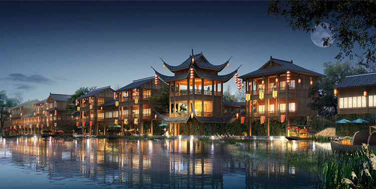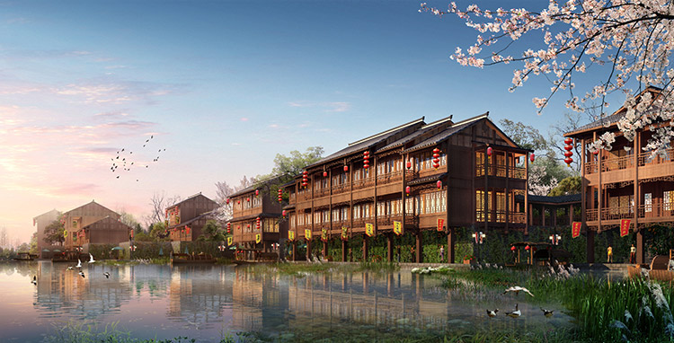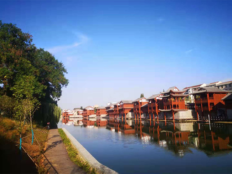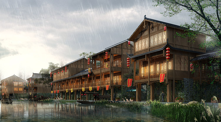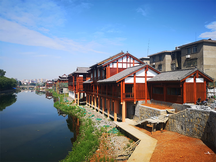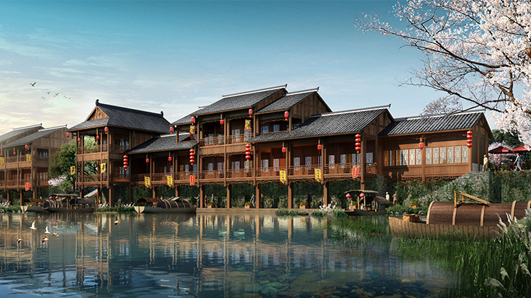 栗河吊腳樓沿河呈狹長不規(guī)則帶狀,南北向進(jìn)深約25m,東西向?qū)捈s527m。項目占地面積12486.41平米(18.73畝),總建筑面積4520.87平米,分為A至J十個單體建筑,建筑層數(shù)1~2層,門面商鋪45間,沿河道均勻分布。建筑依據(jù)場地,與南側(cè)道路平行布置,建筑主入口面向場地南側(cè)道路,建筑沿河布局,底部1層為架空空間,其上為主體建筑,建筑整體風(fēng)格風(fēng)貌為仿明清時代,外觀簡潔、大方,給人以明朗、周正的空間體驗。契合時代新形象,尺度更為親切。場地內(nèi)部景觀主要由硬質(zhì)景觀與軟質(zhì)景觀共同構(gòu)成。硬質(zhì)景觀主要包括廣場、步道和活動場地,軟質(zhì)景觀主要是綠化種植。
